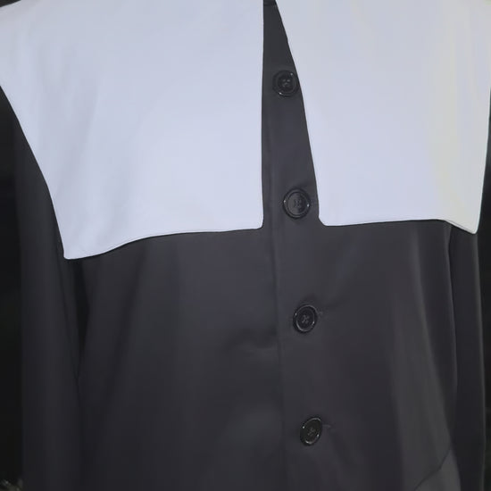 The jacket has long sleeves, faux flap pockets, and a button down front. The below-the-knee pants have an elasticized waist and band accents at the leg openings. The detachable collar and cuffs attach to the coat with snaps.